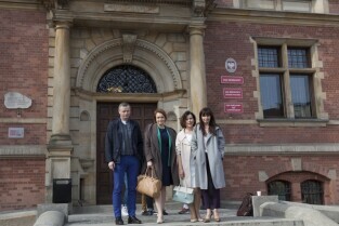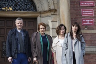 Plan zdjęciowy serialu "Prawo Agaty" emitowanego w telewizji TVN. Gdańsk, przed wejściem do Nowego Ratusza. Nz. od lewej: Wojciech Majchrzak, Daria Widawska, Katarzyna Herman, Agnieszka Dygant