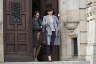 Plan zdjęciowy serialu "Prawo Agaty" emitowanego w telewizji TVN. Gdańsk, przed wejściem do Nowego Ratusza. Nz. Agnieszka Dygant