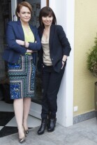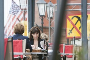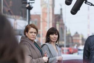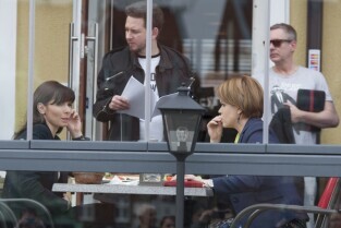 Plan zdjęciowy serialu "Prawo Agaty" emitowanego w telewizji TVN. Gdańsk, przed wejściem do Nowego Ratusza. Nz. Agnieszka Dygant i Daria Widawska