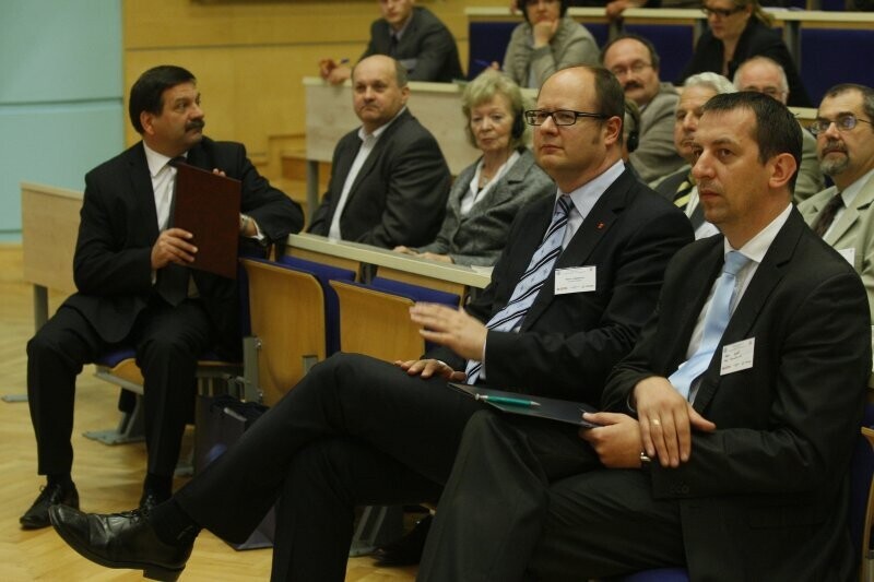 "Zbiorowe Prawo Pracy w XXI w.". Konferencja naukowa w 30. rocznicę powstania NSZZ Solidarność. Nz. Członek Zarządu Województwa Pomorskiego Adam Leik (po prawej) i Prezydent Gdańska Paweł Adamowicz, po lewej w tle Przewodniczący NSZZ "Solidarność" Janusz Śniadek