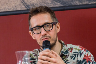 Gdańsk, Biblioteka Manhattan. Premiera książki - cegiełki o Bazylice św. Mikołaja “Niebajka o Mikołaju”. Nz. Szczepan Troka Wysocki