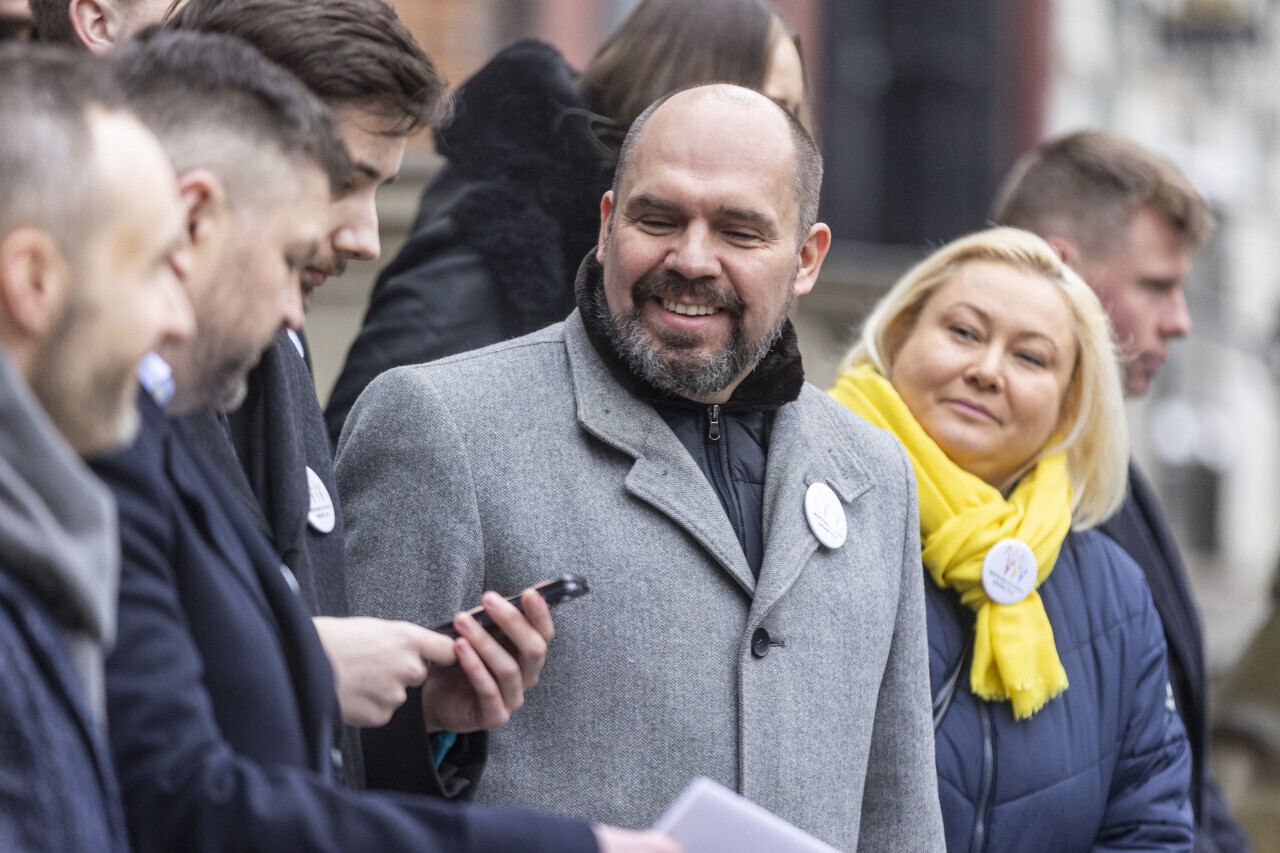 Gdańsk. Na przedprożu Dworu Artusa odbyła się prezentacja kandydatów w zbliżających się wyborach samorządowych z ramienia Komitetu Wspólna Gdańska Droga 2050. Nz. Maciej Goliszewski