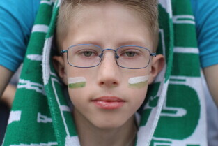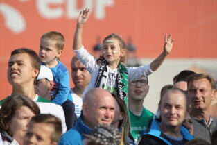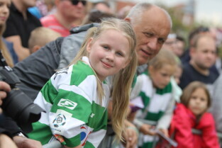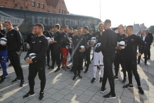 Gdańsk. Plac przy Filharmonii Bałtyckiej na Ołowiance. Prezentacja Lechii Gdańsk.