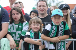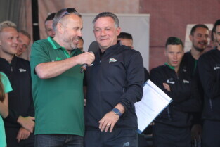 Gdańsk. Plac przy Filharmonii Bałtyckiej na Ołowiance. Prezentacja Lechii Gdańsk. Nz. Radny Andrzej Kowalczys, Wiceprezydent Gdańska Aleksandra Dulkiewicz i Piekarz Andrzej Szydłowski.