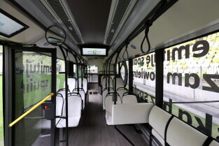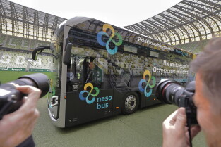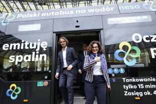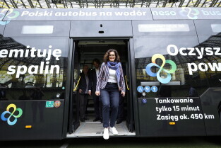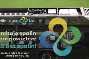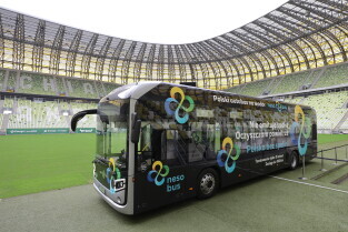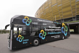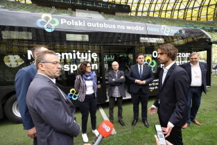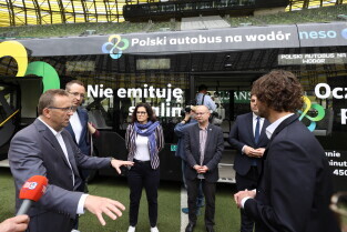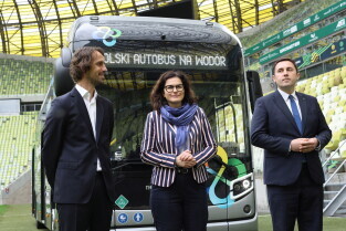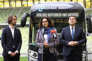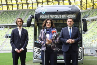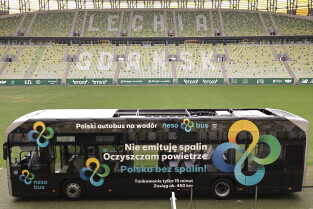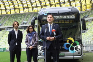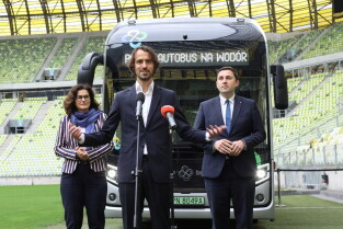 Gdańsk.Prezentacja autobusu o napędzie wodorowym na stadionie Polsat Plus Arena.