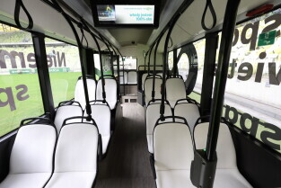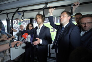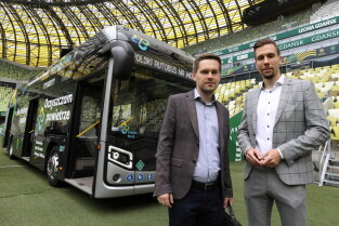 Gdańsk.Prezentacja autobusu o napędzie wodorowym na stadionie Polsat Plus Arena. Nz. Radni: Michał Hajduk i Łukasz Bejm.