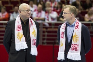 Prezentacja pucharu i Ambasadorów Mistrzostw Europy Piłkarzy Ręcznych 2016. Gdańsk, Sopot. Ergo Arena. Nz. od lewej: Andrzej Trojanowski i Marcin Herra