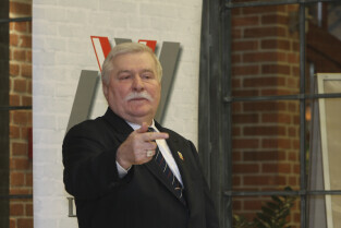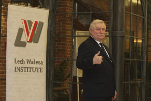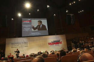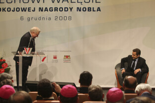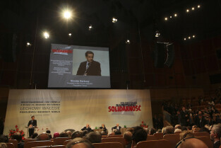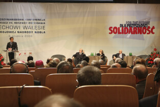 Konferencja Solidarność dla Przyszłości w ramach obchodów 25-lecia przyznania Lechowi Wałęsie Pokojowej Nagrody Nobla. Nz. Lech Wałęsa