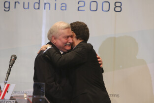 Konferencja Solidarność dla Przyszłości w ramach obchodów 25-lecia przyznania Lechowi Wałęsie Pokojowej Nagrody Nobla. Nz. Lech Wałęsa i Nicolas Sarkozy