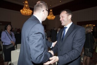 Prezydent Gdańska Paweł Adamowicz otrzymał tytuł "Człowieka Roku 2012" w konkursie organizowanym przez Dziennik Bałtycki. Sopot, Grand Hotel. Nz. gratulacje składa Redaktor Naczelny Dziennika Bałtyckiego Mariusz Szmidka