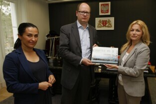 Dyrektor Hotelu Gdańsk Karolina Wójcik przekazuje Prezydentowi Gdańska Pawłowi Adamowiczowi pamiątkowe zdjęcie oraz piłkę podpisaną przez piłkarzy Reprezentacji Hiszpanii podczas ich pobytu w Hotelu Gdańsk w trakcie UEFA Euro 2012. Gdańsk, Urząd Miejski