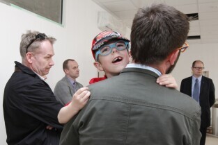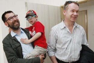 Wizyta Prezydenta Gdańska Pawła Adamowicza w nowej, jeszcze remontowanej, siedzibie Fundacji Żyć z Pompą przy ul. Nowej Ogrody w Gdańsku. Nz. Andrzej Stawicki z synem Stasiem, po prawej aktor i fundator Fundacji Mirosław Baka
