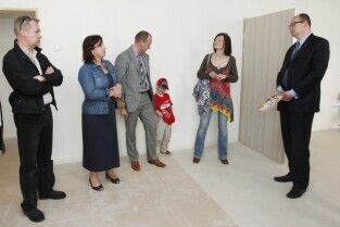 Wizyta Prezydenta Gdańska Pawła Adamowicza w nowej, jeszcze remontowanej, siedzibie Fundacji Żyć z Pompą przy ul. Nowej Ogrody w Gdańsku. Nz. Andrzej Stawicki z synem Stasiem , po prawej aktor i fundator Fundacji Mirosław Baka oraz Wiceprezes Fundacji dr n. med. Agnieszka Szlagatys - Sidorkiewicz