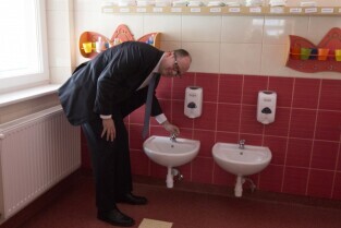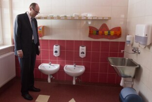 Prezydent Gdańska Paweł Adamowicz podczas odwiedzin wyremontowanych sal żłobka "Kasztanek" przy ul. Piastowskiej w gdańskiej dzielnicy Przymorze