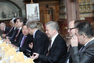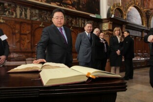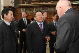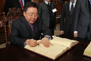 Gdańsk, Dwór Artusa. Prezydent Mongolii Tsakhiagiin Elbegdorj spotkał się m.in. z Marszałkiem Senatu RP Bogdanem Borusewiczem, Wojewodą Pomorskim Ryszardem Stachurskim i Prezydentem Gdańska Pawłem Adamowiczem.