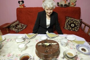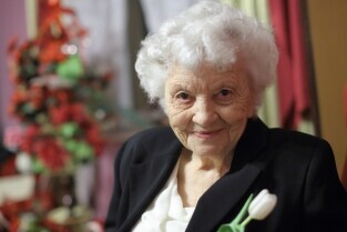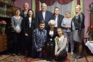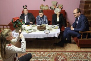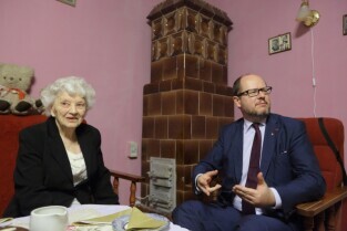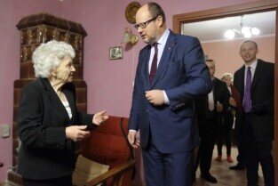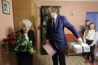 Gdańsk. Prezydent Gdańska Paweł Adamowicz na urodzinach u 95-letniej Haliny Myszkier.