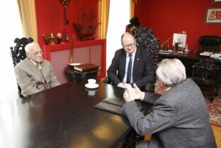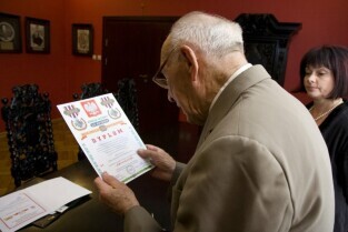 Urząd Miejski w Gdańsku. Nadanie Prezydentowi Gdańska Pawłowi Adamowiczowi Kombatanckiego Krzyża Pamiątkowego "Zwycięzcom" przez Związek Kombatantów RP i Byłych Więźniów Politycznych. Nz. od lewej Prezydent Paweł Adamowicz i płk pil. mgr Tadeusz Siczek.