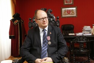 Urząd Miejski w Gdańsku. Nadanie Prezydentowi Gdańska Pawłowi Adamowiczowi Kombatanckiego Krzyża Pamiątkowego "Zwycięzcom" przez Związek Kombatantów RP i Byłych Więźniów Politycznych.