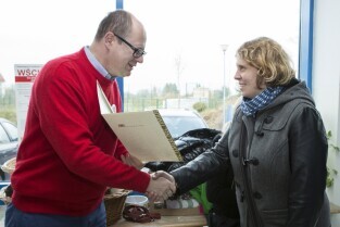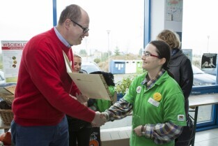 Prezydent Gdańska Paweł Adamowicz wręcza podziękowania wolontariuszom w schronisku dla bezdomnych zwierząt "Promyk" w Gdańsku Kokoszkach
