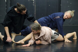 Gdańsk. Próba medialna spektaklu ONE Teatru Dada von Bzdülöw. Występują: Katarzyna Ustowska, Piotr Stanek, Patryk Durski.