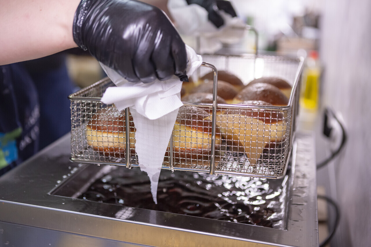 Gdańsk. W Tłusty Czwartek, już od północy, w kuchni kawiarni Caffe Aktywni na Siedlcach trwa produkcja ogromnej ilości pączków. W produkcji tradycyjnych słodkości pomagają osoby z niepełnosprawnościami intelektualnymi.