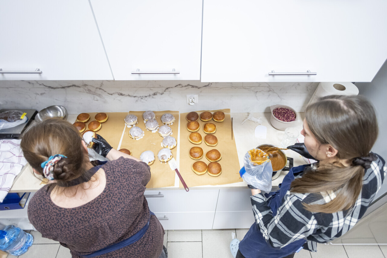 Gdańsk. W Tłusty Czwartek, już od północy, w kuchni kawiarni Caffe Aktywni na Siedlcach trwa produkcja ogromnej ilości pączków. W produkcji tradycyjnych słodkości pomagają osoby z niepełnosprawnościami intelektualnymi.