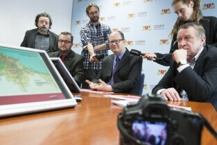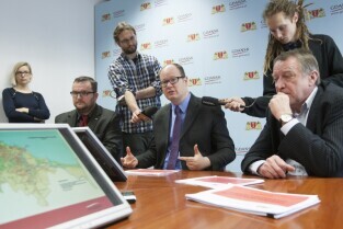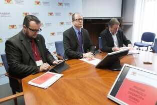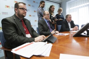 Urząd Miejski w Gdańsku. Konferencja prasowa dotycząca programowi modernizacji chodników w Gdańsku. Nz. od lewej: Dyrektor Wydziału Programów Rozwojowych UMG Marcin Dawidowski, Prezydent Gdańska Paweł Adamowicz, Dyrektor ZDiZ w Gdańsku Mieczysław Kotłowski