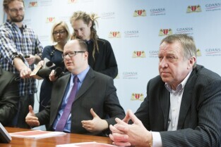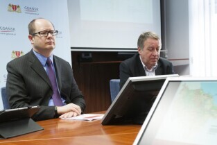 Urząd Miejski w Gdańsku. Konferencja prasowa dotycząca programowi modernizacji chodników w Gdańsku. Nz. od lewej: Prezydent Gdańska Paweł Adamowicz i Dyrektor ZDiZ w Gdańsku Mieczysław Kotłowski