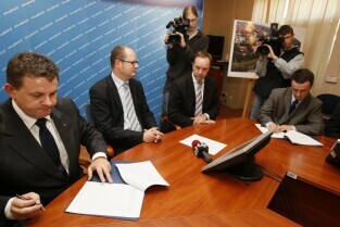 Podpisanie umowy ze Scott Wilson sp. z o.o. na sporządzenie dokumentacji projektowej przystanku SKM Śródmieście oraz przedłużenia linii od dworca Gdańsk Gł. Nz. od lewej: Prezes PKP SKM Maciej Lignowski, Prezydent Gdańska Paweł Adamowicz, Marszałek Woj. Pomorskiego Mieczysław Struk, Dyrektor ds. Projektów Scott Wilson Rafał Poborski