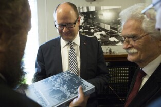 Promocja książki Dietera Schenka pt. "Gdańsk 1930-1945. Koniec pewnego Wolnego Miasta". Gdańsk, Muzeum Poczty Polskiej. Nz. Prezydent Gdańska Paweł Adamowicz i Dieter Schenk