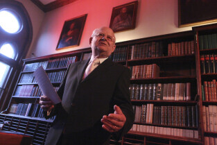 Promocja książki "Gdańsk w literaturze", która odbyła się w Czytelni Biblioteki Gdańskiej PAN. Nz. poeta Aleksander Jurewicz, w tle Stanisław Rosiek