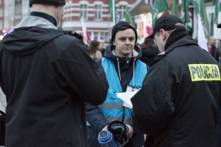 Marsz Młodzieży Wszechpolskiej - demonstracja przeciwko feminizmowi w odpowiedzi na dzisiejszą Manifę Trójmiasta. Gdańsk, Most Zielony i Długi Targ. Nz. Przedstawiciel Urzędu Miejskiego w Gdańsku Grzegorz Graefling