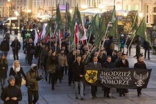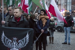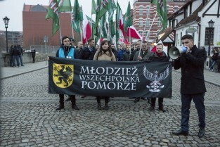 Marsz Młodzieży Wszechpolskiej - demonstracja przeciwko feminizmowi w odpowiedzi na dzisiejszą Manifę Trójmiasta. Gdańsk, Most Zielony i Długi Targ