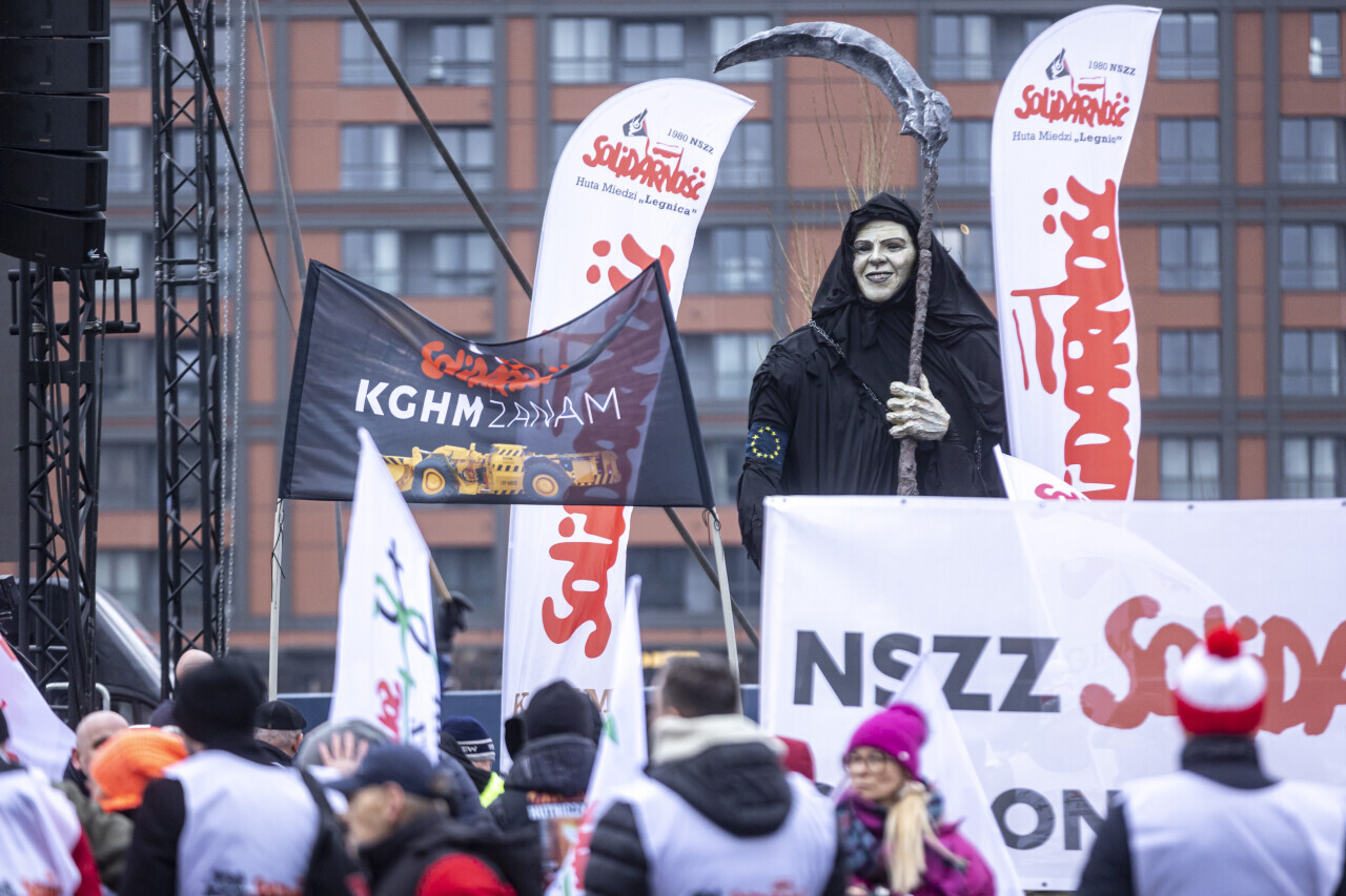 Gdańsk. Protest przeciwko Zielonemu Ładowi zorganizowany przez Komisją Krajową NSZZ Solidarność pod Europejskim Centrum Solidarności, w którym trwa Kolegium Komisarzy UE