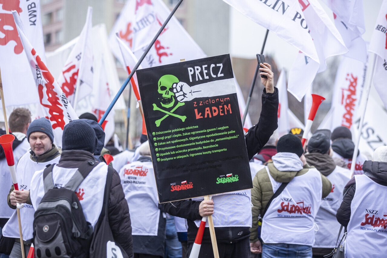 Gdańsk. Protest przeciwko Zielonemu Ładowi zorganizowany przez Komisją Krajową NSZZ Solidarność pod Europejskim Centrum Solidarności, w którym trwa Kolegium Komisarzy UE