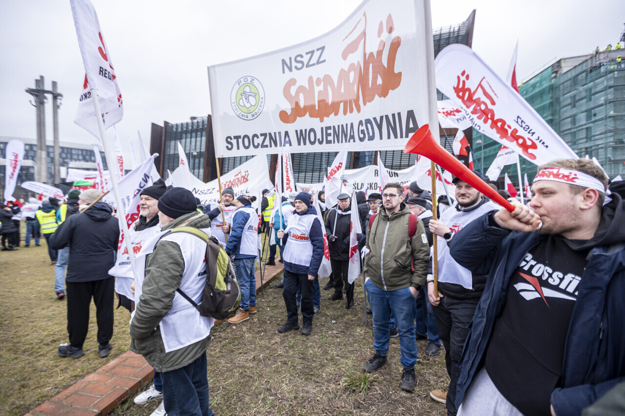 Gdańsk. Protest przeciwko Zielonemu Ładowi zorganizowany przez Komisją Krajową NSZZ Solidarność pod Europejskim Centrum Solidarności, w którym trwa Kolegium Komisarzy UE