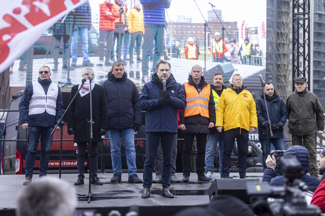 Gdańsk. Protest przeciwko Zielonemu Ładowi zorganizowany przez Komisją Krajową NSZZ Solidarność pod Europejskim Centrum Solidarności, w którym trwa Kolegium Komisarzy UE. Nz. Przewodniczący Solidarności Piotr Duda