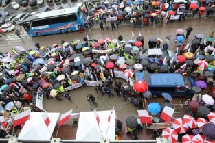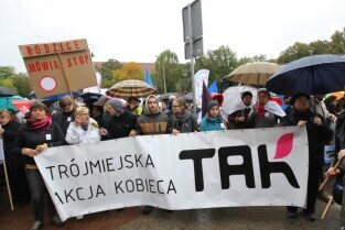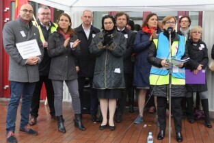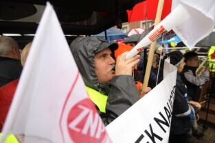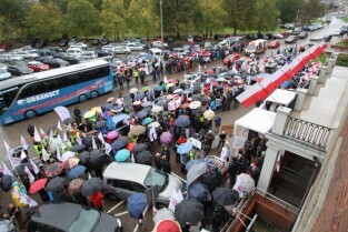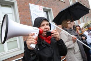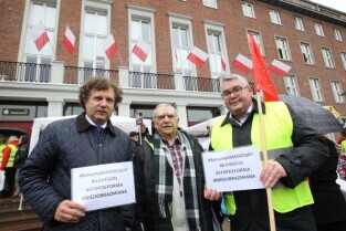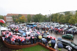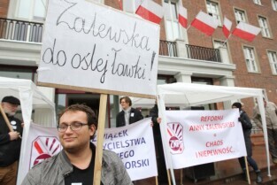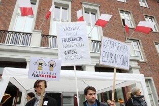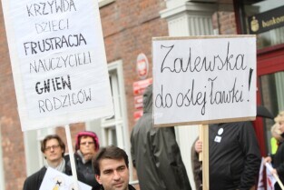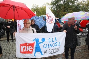 Gdańsk. Nauczyciele z całego Pomorza protestują w Gdańsku pod Urzędem Wojewódzkim. Protestujący Nauczyciele sprzeciwiają się zapowiadanej przez PiS reformie szkolnictwa.