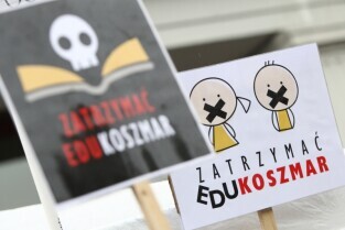 Gdańsk. Nauczyciele z całego Pomorza protestują w Gdańsku pod Urzędem Wojewódzkim. Protestujący Nauczyciele sprzeciwiają się zapowiadanej przez PiS reformie szkolnictwa.