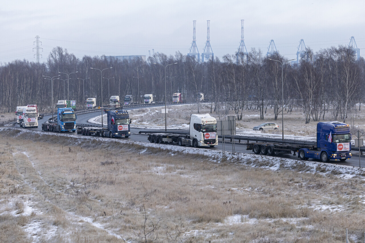Gdańsk. Kierowcy ciężarówek obsługujący porty w Gdańsku i Gdyni zorganizowali protest pod terminalem BalticHub. Kilka dziesiąt tirów zablokowało drogę prowadzącą do portu jadąc w konwoju ze zmniejszoną prędkością. Część kierowców na dwie godziny zablokowała również przejście dla pieszych na drodze prowadzącej do terminalu