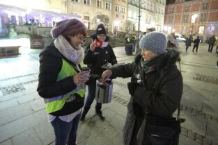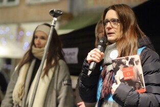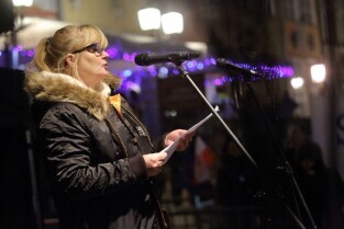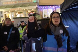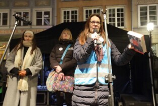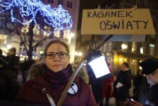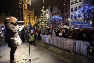 Gdańsk Długi Targ. Protest przeciwko planowanym przez rząd zmianom w oświacie. Nz. Anita Czarniecka.