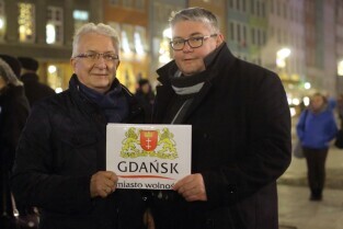 Gdańsk Długi Targ. Protest przeciwko planowanym przez rząd zmianom w oświacie. Nz Edmund Wittbrodt i Wiceprezydent Gdańska Piotr Kowalczuk.