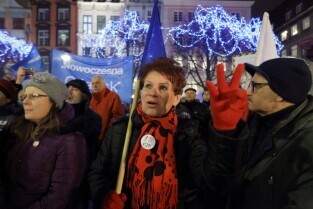 Gdańsk Długi Targ. Protest przeciwko planowanym przez rząd zmianom w oświacie. Nz. (L) Radna Teresa Wasilewska.