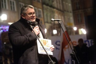 Gdańsk Długi Targ. Protest przeciwko planowanym przez rząd zmianom w oświacie. Nz. Wiceprezydent Gdańska Piotr Kowalczuk.