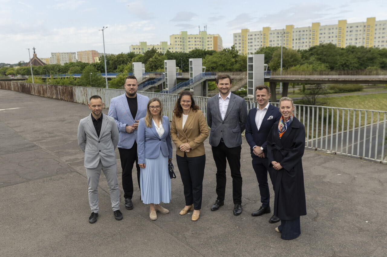 Gdańsk.Przebudowa kładki na Zaspie – briefing prasowy. W konferencji udział wzięli: Aleksandra Dulkiewicz, prezydent Gdańska, Piotr Grzelak, zastępca prezydenta ds. zrównoważonego rozwoju i gospodarki, Agnieszka Owczarczak, przewodnicząca Rady Miasta Gdańska i radny Marcin Makowski.