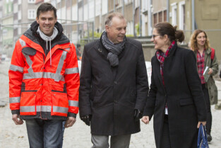 Przebudowa ul. Świętego Ducha w Gdańsku. Nz. od lewej: kierownik budowy Piotr Koprowiak, Z-ca Prezydenta Gdańska Aleksandra Dulkiewicz, Dyrektor Dyrekcji Rozbudowy Miasta Gdańska Włodzimierz Bartosiewicz