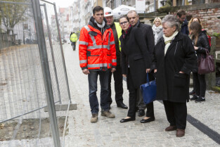 Przebudowa ul. Świętego Ducha w Gdańsku. Nz. od lewej: kierownik budowy Piotr Koprowiak, Z-ca Prezydenta Gdańska Aleksandra Dulkiewicz, Radna Gdańska Teresa Wasilewska, z tyłu Dyrektor Dyrekcji Rozbudowy Miasta Gdańska Włodzimierz Bartosiewicz