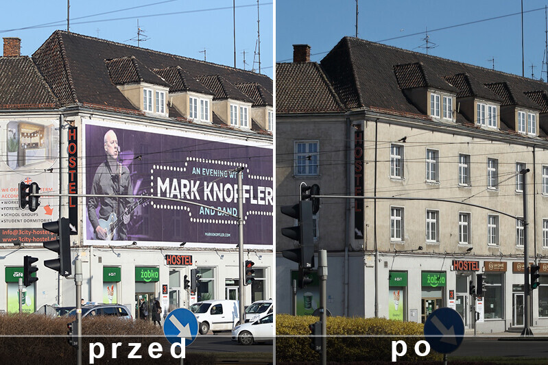 Zdjęcia przed i po budynków z reklamami. Uchwała Krajobrazowa Gdańska