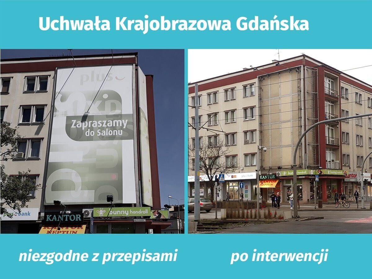 Zdjęcia przed i po budynków z reklamami. Uchwała Krajobrazowa Gdańska