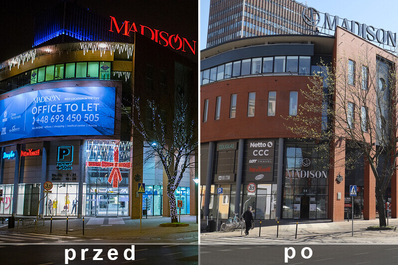 Zdjęcia przed i po budynków z reklamami. Uchwała Krajobrazowa Gdańska